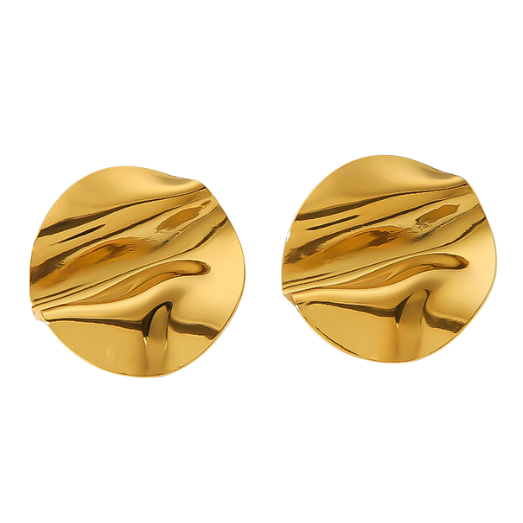 Aretes circulares irregulares, disponibles en dorado y plateado, de acero inoxidable.
